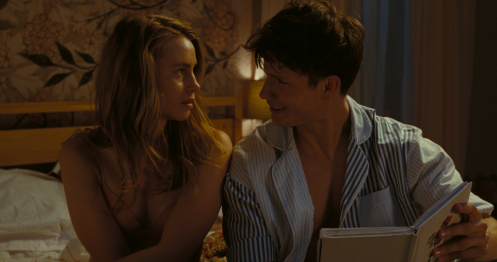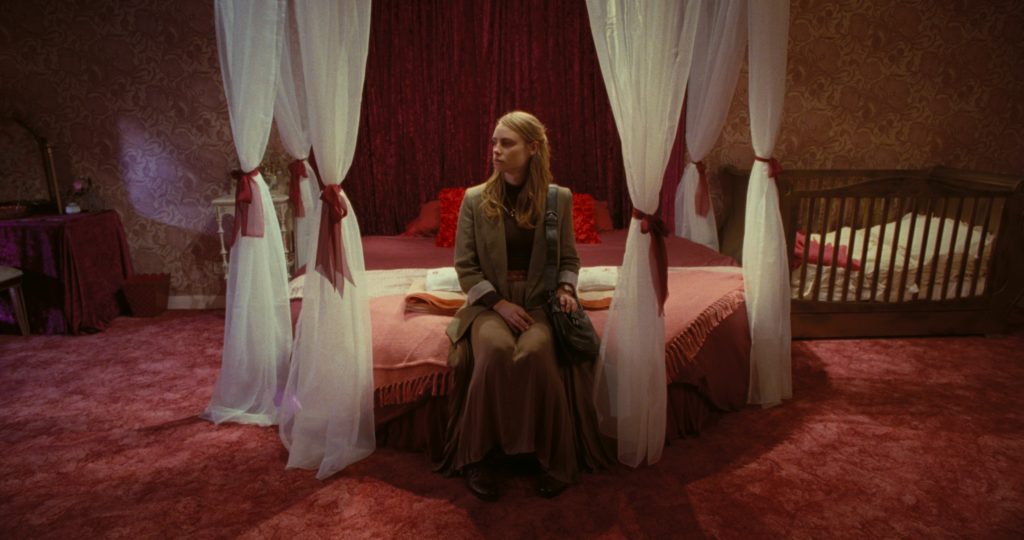 Shot on 35mm and 16mm, cinematographer Aron Meinhardt uses colour to signify Rose’s shifting emotional states throughout the film. Warmer, golden tones open the film when she’s in bed with Travis, who pores over her repetitive drawings of crowns in a book that contains a photo of an unusual and unexpected sexual device—her gift request for Valentine’s Day. Rose’s appointment with Cindy delivers colder blue shades, which highlights the harshness of the film industry. At The Crown Inn, Rose’s room is full of reds and pinks which make it feel very feminine and womb-like. At the room’s centre sits a heart-shaped bed with a white canopy collected with sheer red bows. In addition to its dark brown furniture, the room also contains a crib, plenty of mirrors, and a white and gold rotary phone with floral detailing. The set design, even back at Rose’s home, is unique and adds depth and richness to her character. The dark moody lighting, which cycles through varying colours and textures, complements the distorted sound design which captures Rose’s fractured mental state.