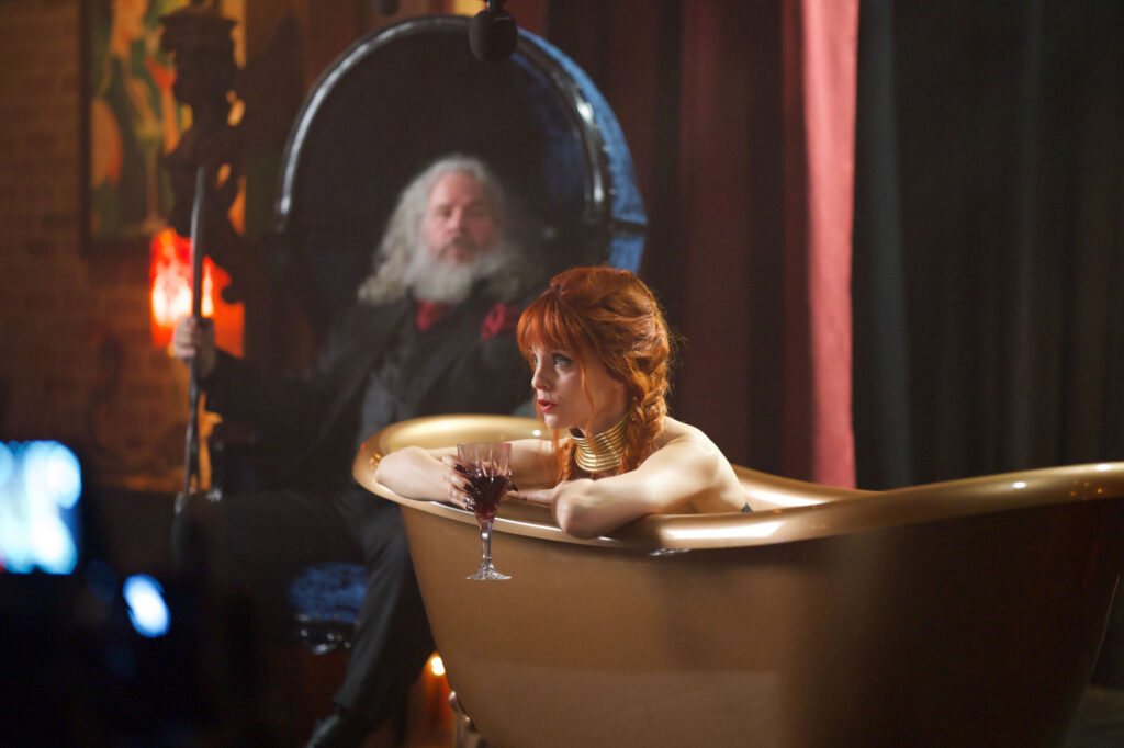 Set in the modern day American South, Elizabeth (Mena Suvari) runs an absinthe bar with Joan (India Eisley) and Helena (Sarah Dumont), which they use as a lair to lure their innocent and not-so-innocent victims via a dating app. Underground, they sleep in coffins, get ready for parties, and dispatch their victims so they can stay fed. Elizabeth, however, still continues her ritual of bathing in women’s blood as one scene shows her sat in a bathtub with three young women dangling above her, tied upside down like bats. Her right-hand man Chuck (Mark Boone Junior) cuts their heads off, allowing their fresh, virginal young blood to cascade into the tub and all over Elizabeth, who rubs the blood into her skin like lotion. Meanwhile, the arrival of vampire hunter Cora (Dichen Lachman), a former mercenary, threatens Elizabeth’s clan, but the all-powerful vampire isn’t worried.