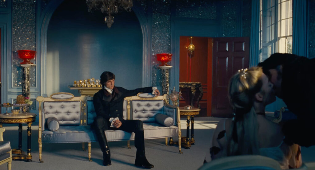“Wuthering Heights” is visually striking in every element, thanks to the excellent work of cinematographer Linus Sandgren, production designer Suzie Davies, set designer Charlotte Dirickx, and costume designer Jacqueline Durran alongside Fennell’s delicious directing. Gorgeous wide shots of the cold, foggy, and windswept Yorkshire Moors help set the film’s moody atmosphere, while the sets of Wuthering Heights and Thrushcross Grange juxtapose two different lifestyles; the former with darker and more neutral colours and the latter dripping magnificently in bold Technicolor. Red in particular, the symbol of passion and danger, makes a more prominent appearance in both the costumes and set design.